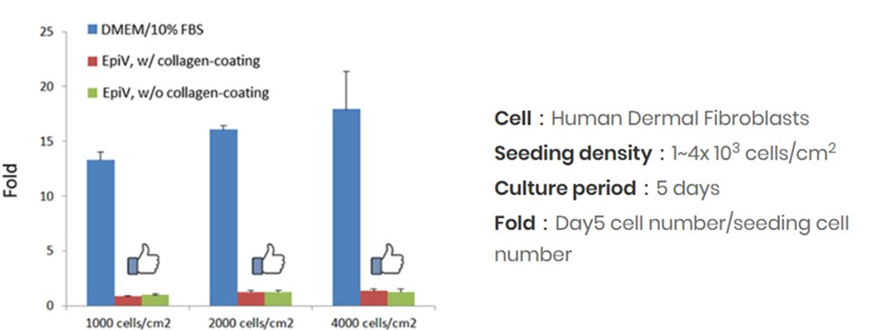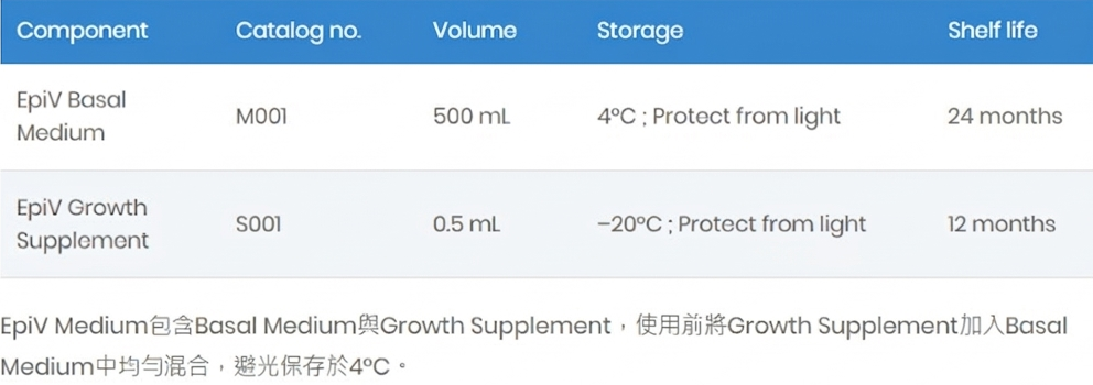EpiV 培養基是一款無血清 (Serum-free)、無牛腦垂體提取物 (Bovine Pituitary Extract, BPE-free)、無人類血小板裂解液 (Human Platelet Lysate, HPL-free)、無霍亂毒素 (Cholera Toxin-free)、化學成份明確 (Chemically-defined) 的上皮細胞培養基,用於上皮細胞 (Epithelial cells) 與角質細胞 (Keratinocytes) 的培養與擴增,無需使用滋養細胞 (Feeder-free),並同時避免纖維母細胞 (Fibroblasts) 的過度生長,提供細胞培養最佳的貼附與生長環境,加速細胞增值的速率。