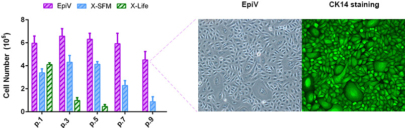 > Keratinocytes in EpiV continuously grow well into high passages.